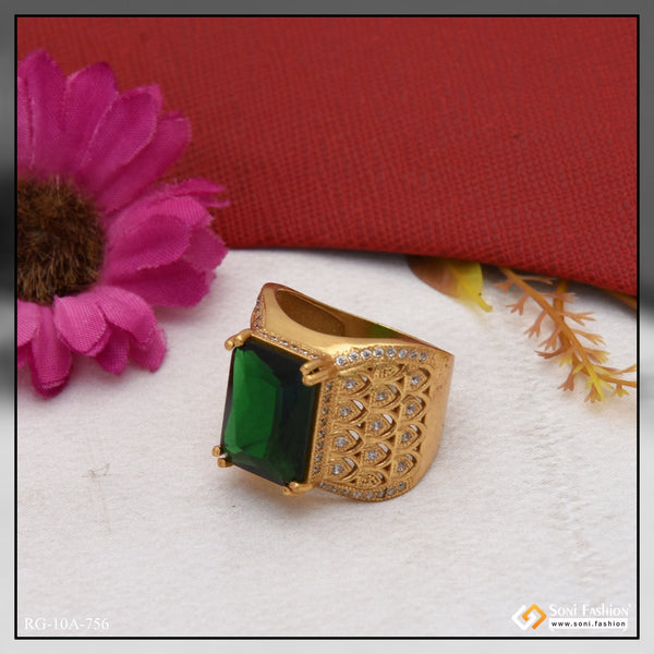 1 Gram Gold Forming Green Stone with Diamond Delicate Design Ring for Men - Style A960
