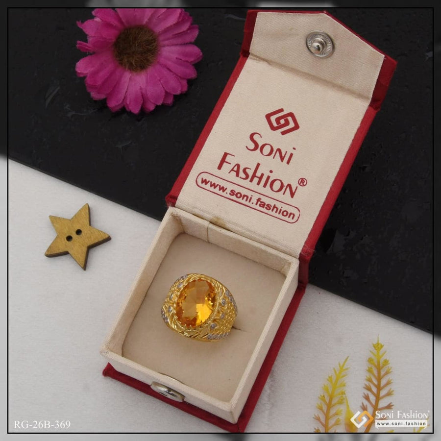 Elevate your style with this 1 Gram Gold Plated Yellow Stone Ring for men. Crafted in brass with a miligram gold plating, it features a matte finish and a detailed...