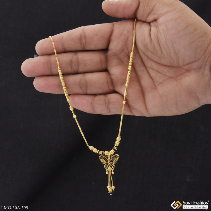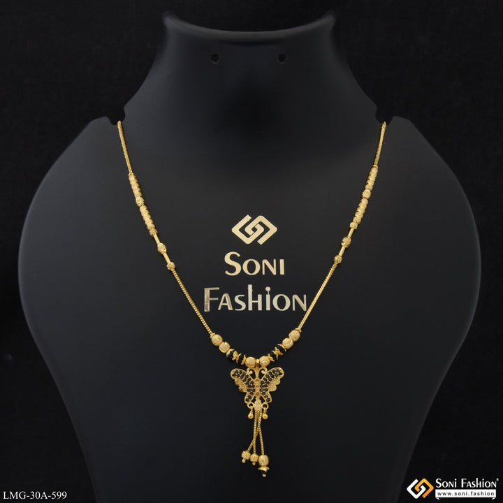 This 1 Gram Gold Plated Mangalsutra for Women is a shining, royal piece with a beautiful butterfly design. Made with miligram gold and brass, this latest trend filigree design also features a diamond and black moti for added elegance. With a one-line design, it's a perfect addition to any jewellery collection.
