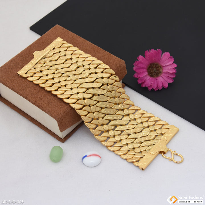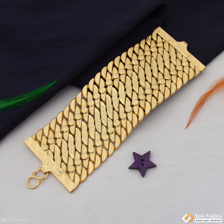 This Pokal Dainty Design Gold Plated Bracelet is textured and handmade with a unique filigree design. Made from the highest quality brass and plated with HID_Reg_Plating, it boasts a beautiful shine that is sure to grab attention. The extra-broad style adds to its bold and stylish look.