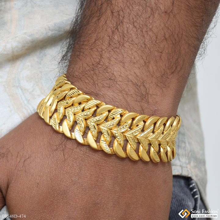 Expertly crafted with shining, gold-plated brass, this 1 Gram Pokal bracelet boasts a popular Rajwadi filigree design and broad, hollow shape. A sophisticated piece for men, this bracelet exudes luxury and style with its miligram gold finish. Elevate your look with this stylish and elegant bracelet.