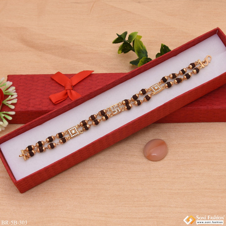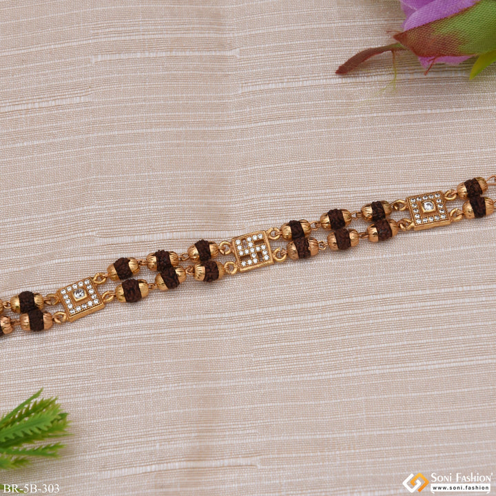 Introducing our 2 in 1 Sathiya bracelet, perfect for both Rakshabandhan and religious occasions. Handmade with textured brass and gold plating, this gorgeous bracelet is adorned with a diamond and brown accents. Add a touch of elegance and tradition to any outfit with our Bracelet-Regular.