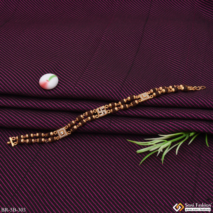 Introducing our 2 in 1 Sathiya bracelet, perfect for both Rakshabandhan and religious occasions. Handmade with textured brass and gold plating, this gorgeous bracelet is adorned with a diamond and brown...