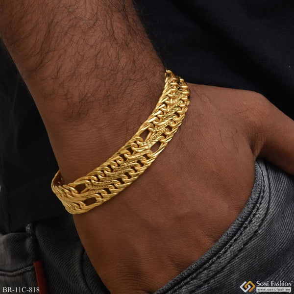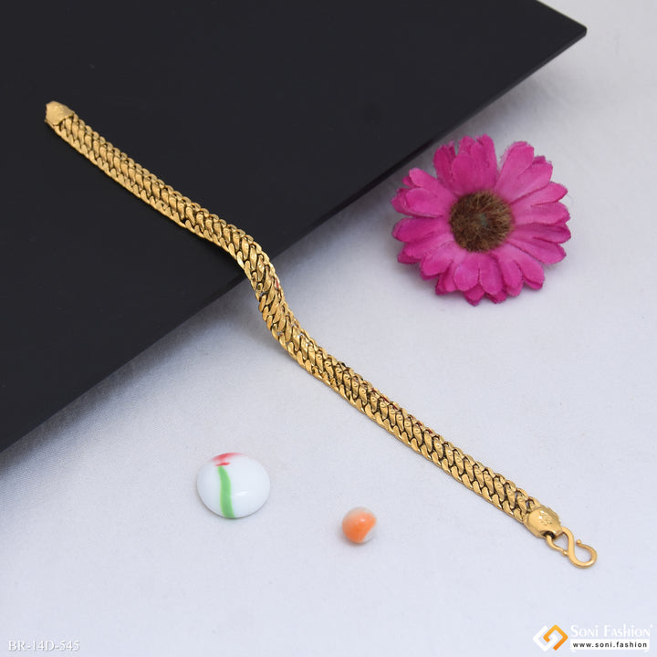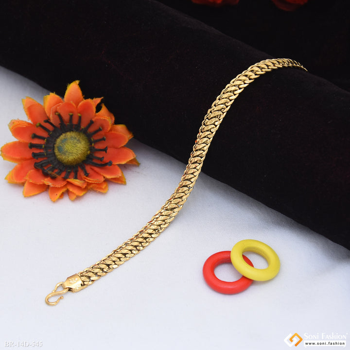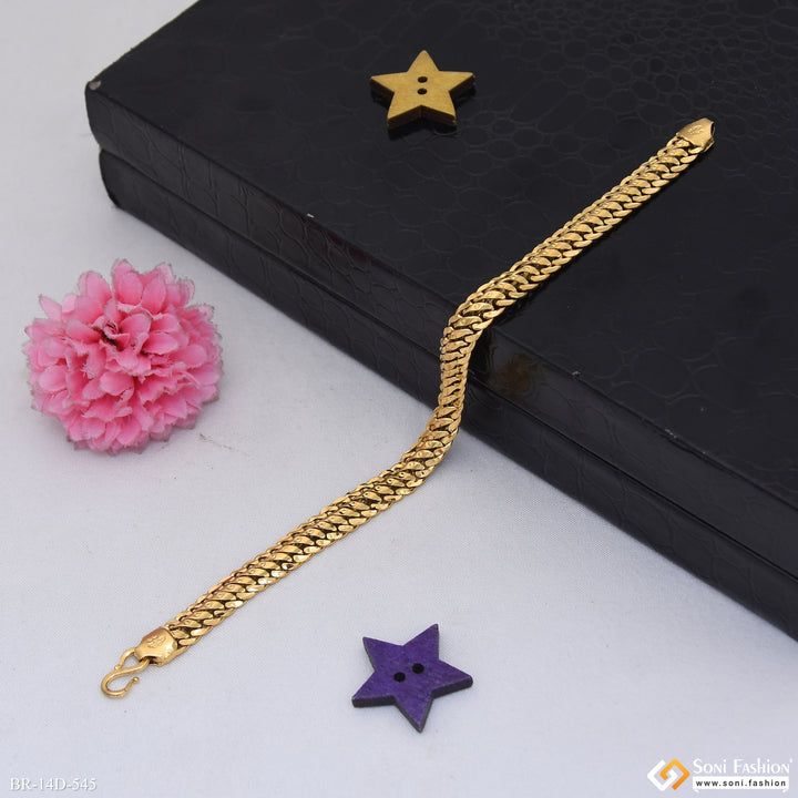 Experience luxury with our Excellent Design 18k Gold Plated Linked Bracelet for Men. Crafted with shining brass and intricate filigree design, this bracelet exudes a royal charm. Coated with Hid_Reg_Plating, the 18K gold adds a touch of elegance. Elevate your style with this golden bracelet.
