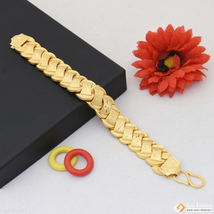 Experience luxury and style with our Latest Design Gold Plated Pokal Bracelet for Men. This shining Rajwadi bracelet features a unique filigree design and is made of brass for durability. Its hollow and matt appearance adds a touch of sophistication. With Hid_Reg_Plating, this golden bracelet is a must-have for any fashion-forward man.
