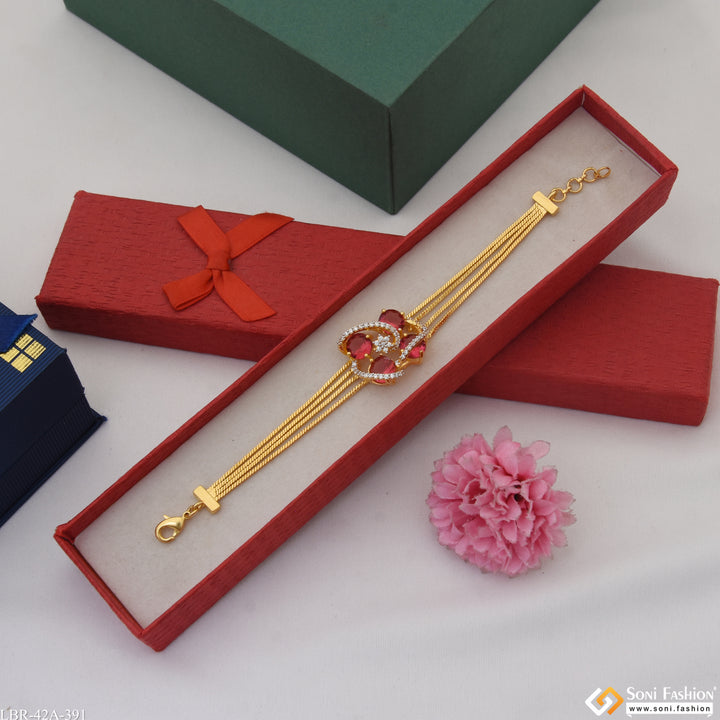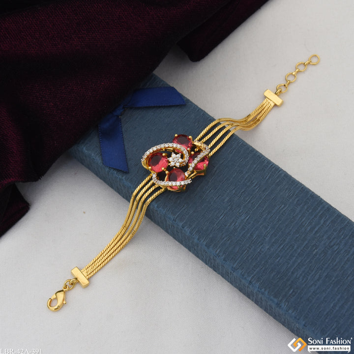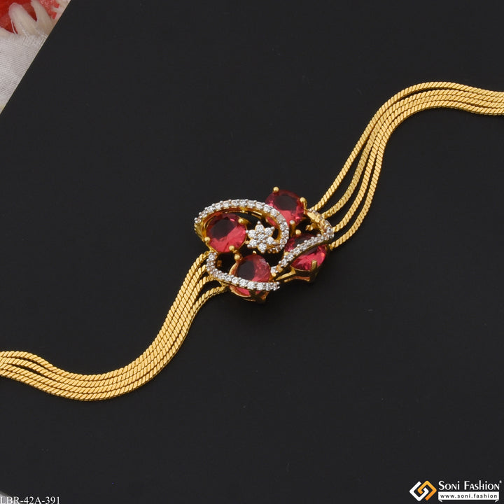 Elevate your style with our 1 Gram Gold Plated Sparkling Design Bracelet. The shining brass bracelet features a stunning pink stone and a sparkling diamond for a touch of glamour. With its latest trend design, this golden bracelet is perfect for any fashionable lady.