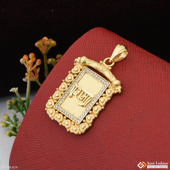 This Ram Popular Design Gold Plated Pendant for Men boasts a shining, religious rectangle design featuring a filigree Ram, adorned with a diamond and made of brass. The pendant's matt finish...