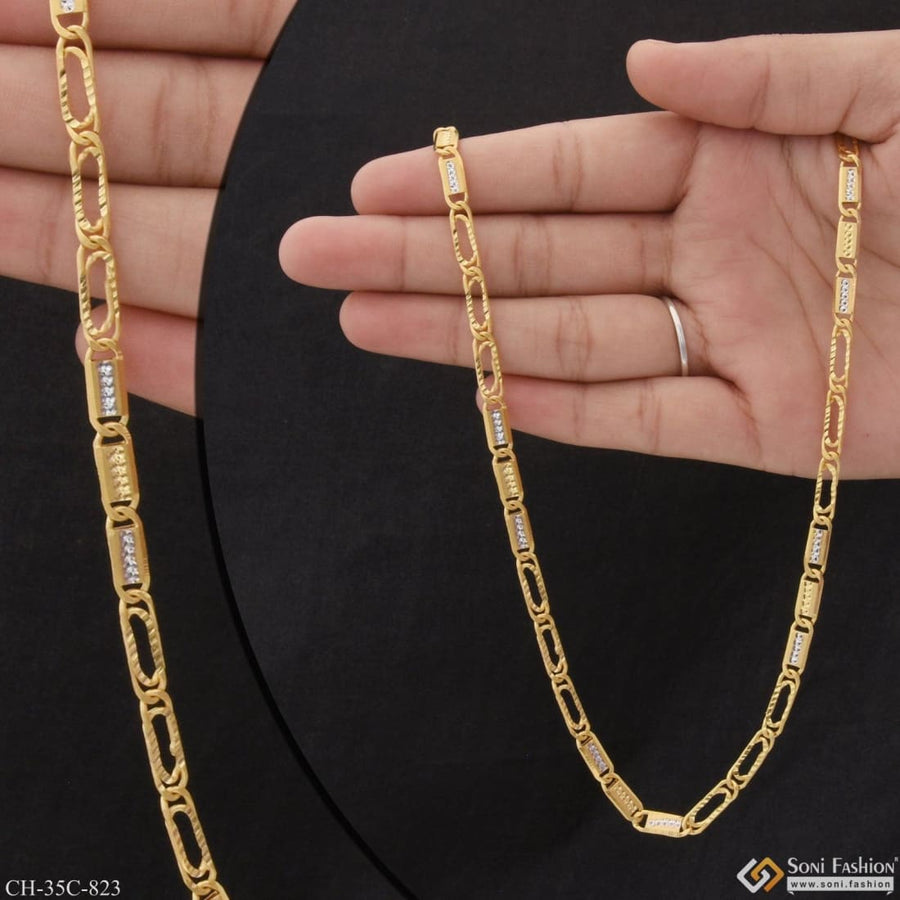 This 1 gram gold-plated Nawabi Pokal chain for men combines a shining filigree design with a classic hollow brass structure. Measuring 20 inches, it features a stylish matt finish that...