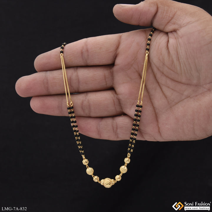 This latest design gold-plated mangalsutra features a sleek single-line style crafted from durable brass with black moti beads. Its shining golden plating adds a rich, elegant look perfect for everyday wear or special occasions, making it a meaningful and stylish accessory for women.