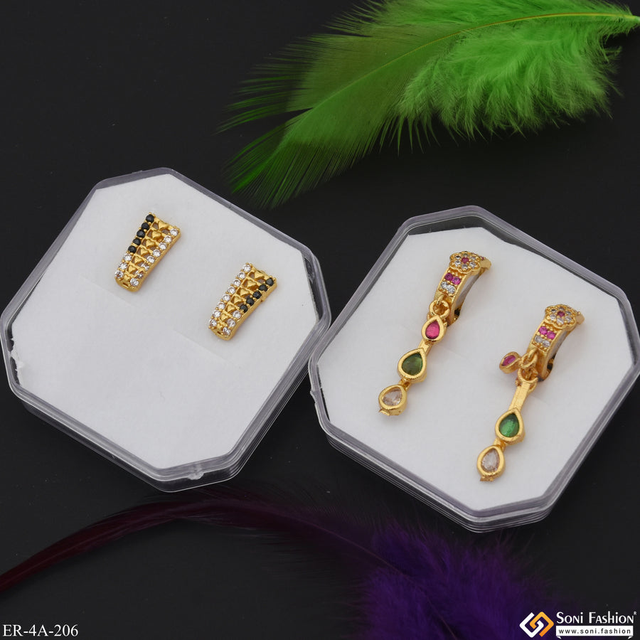 Elevate your style with our Designer Gold Plated Earrings for Ladies. These trendy brass earrings feature a unique combination of shining and matte finishes with hidden regular plating. The diamond-inspired...