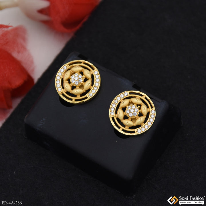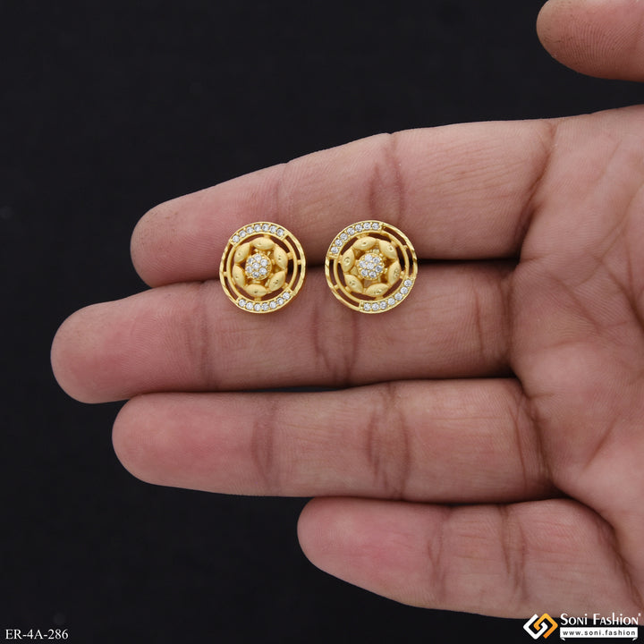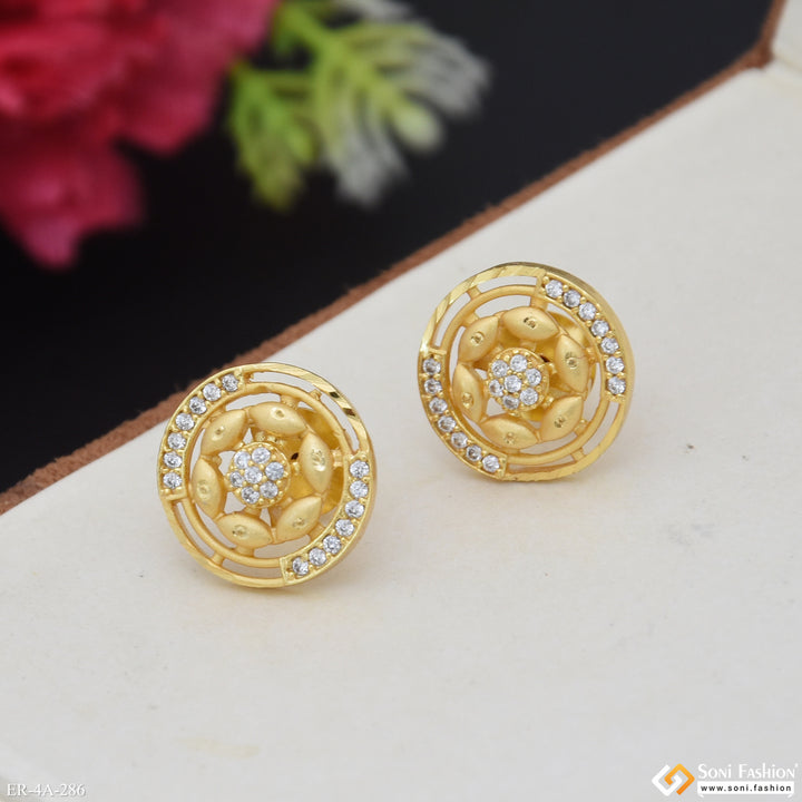 These Superior Quality Gold Plated Earrings feature a shining round design with a hidden regular plating finish. Made from durable brass and accented with diamond-like details, they offer a stylish and elegant accessory perfect for any occasion. The golden hue adds a touch of luxury while maintaining affordability and lasting wear.