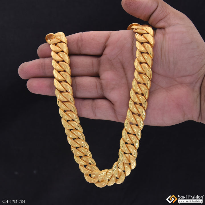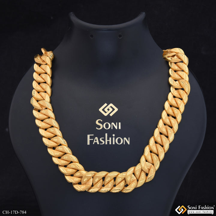 Impress with our latest design gold plated pokal chain for men. This shining, 22 inch chain features a Rajwadi filigree design and broad, hollow links in a matte finish. Made with brass and hidden regulated plating, this golden chain exudes a professional and stylish look. Elevate your style with this elegant chain.