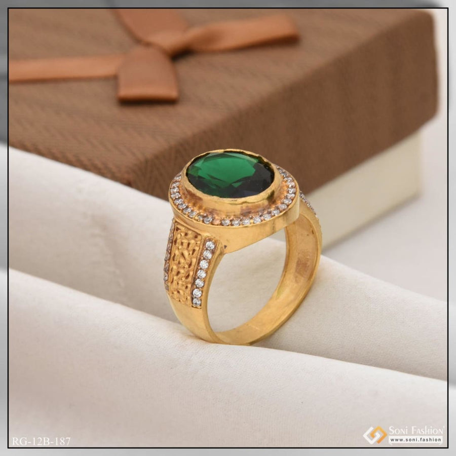 1 Gram Gold Plated Green Stone with Diamond Best Quality Ring for Men - Style B187