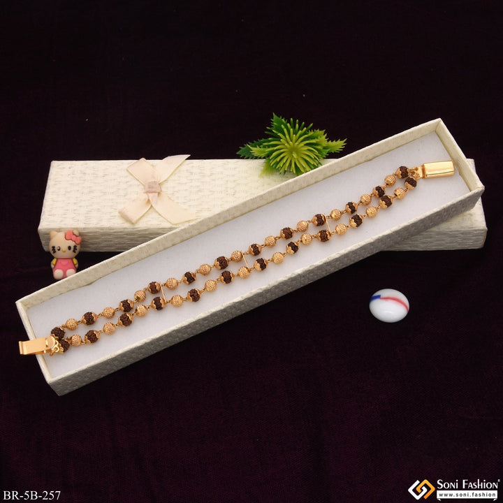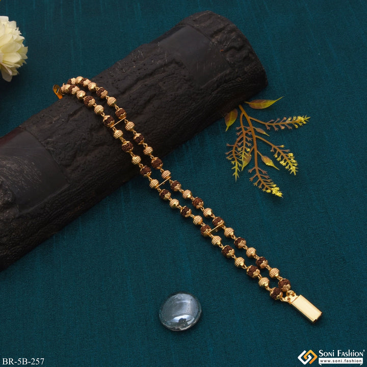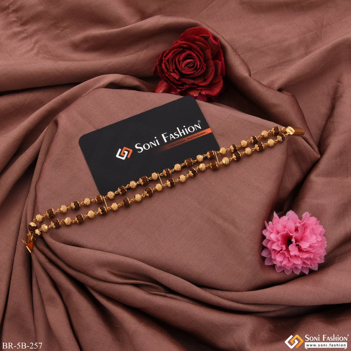 Indulge in luxury with our 2 in 1 Golden Boll Glamorous Bracelet. Made from brass, it features a textured design and Rudraksha beads, perfect for adding a touch of elegance to any outfit. The handmade construction and gold plating make it a unique and religious piece, perfect for special occasions like Rakshabandhan.