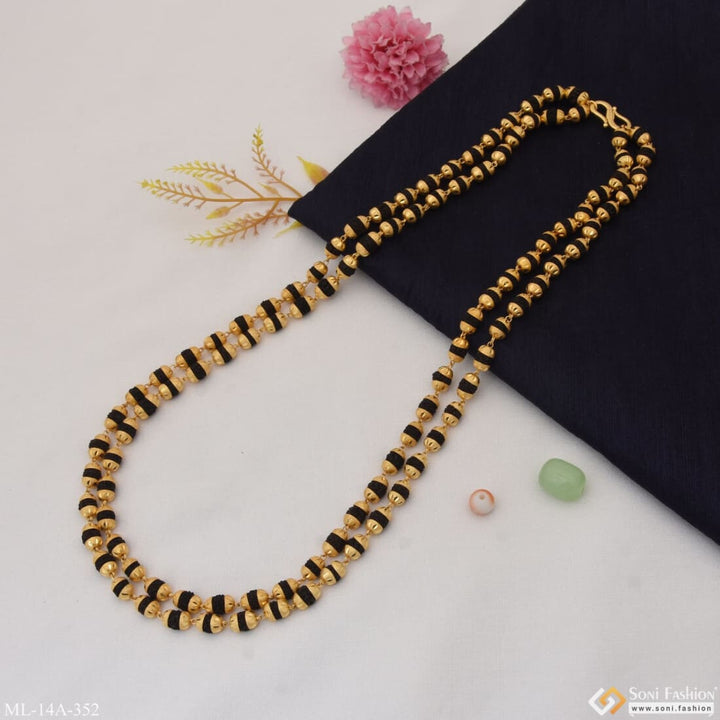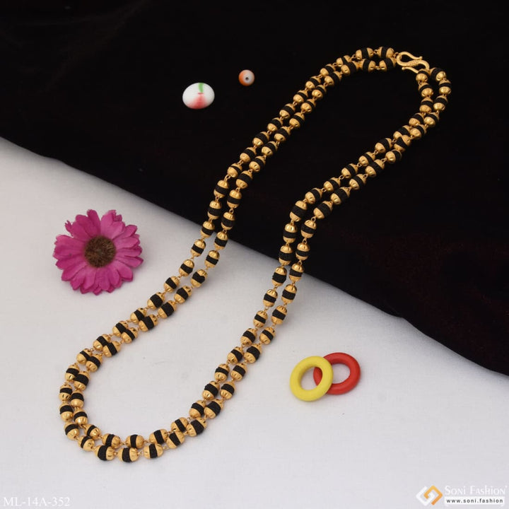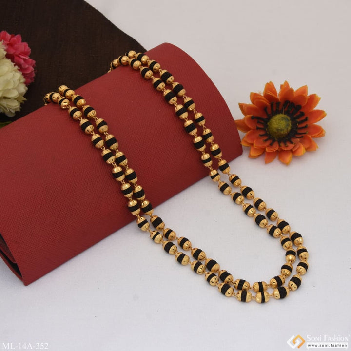 Introducing our 2-line Rudraksha Mala for men, designed with elegance and quality in mind. This trending accessory features a shining gold plating, filigree design, and black brass beads. Personalize your spiritual journey with this popular religious Rajwadi piece. Perfect for everyday wear with its hidden plated finish.