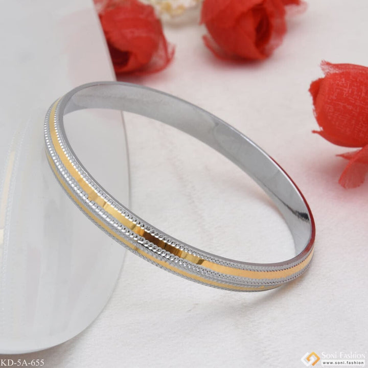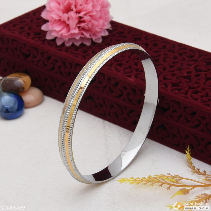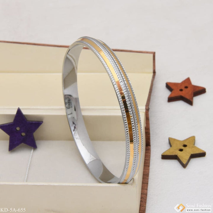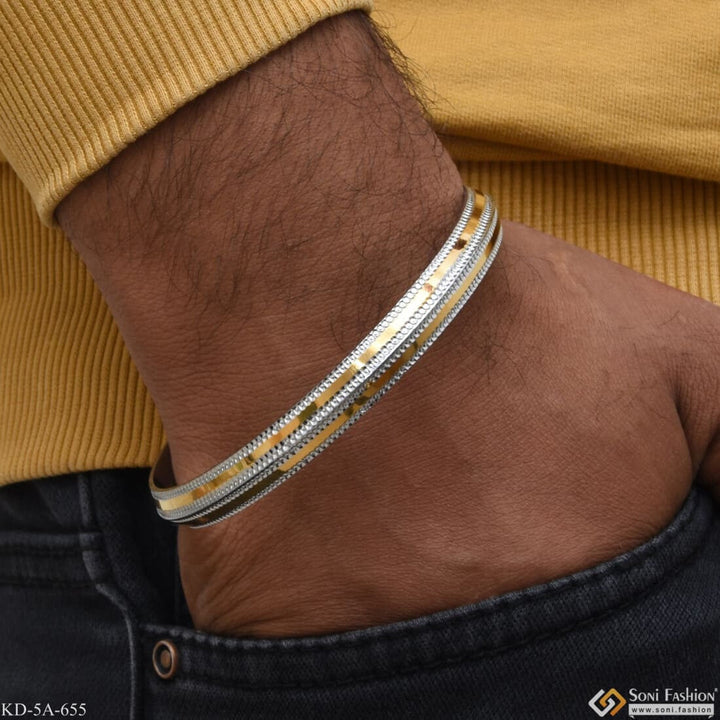 This 2 Line Unique Design Premium-Grade Quality Gold Plated punjabi Kada for Men is a limited edition piece with textured stainless steel and a shining silver finish. Its royal round design...