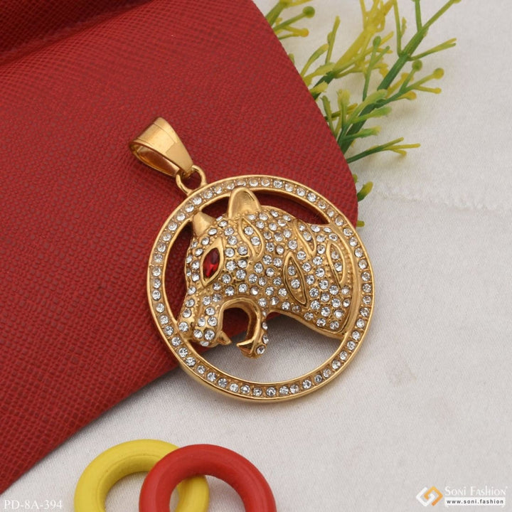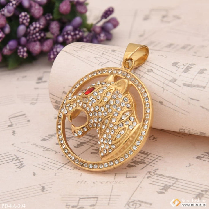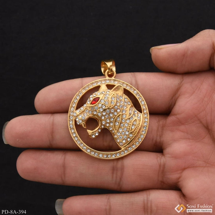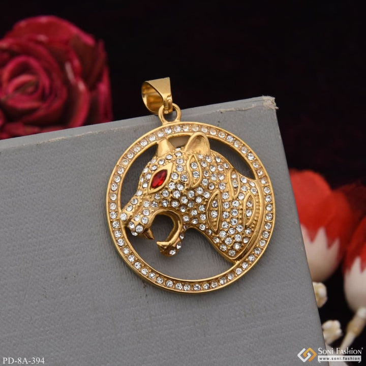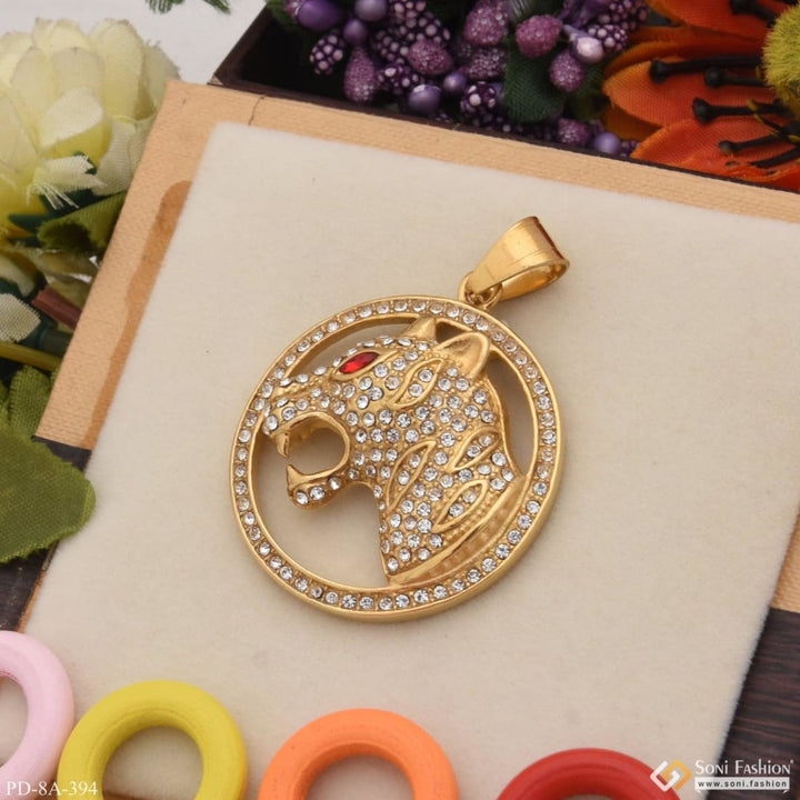 This Attractive Jaguar Face with Diamonds in Round Pendant is a unique statement piece. Crafted out of Stainless Steel, it features a textured finish and is coated with gold plating for a glossy, royal shine. A round pendant, featuring a jaguar face and surrounded with halo of diamonds, gives this piece a modern and hip hop look. Elevate any look with this piece of the latest Rajwadi style.