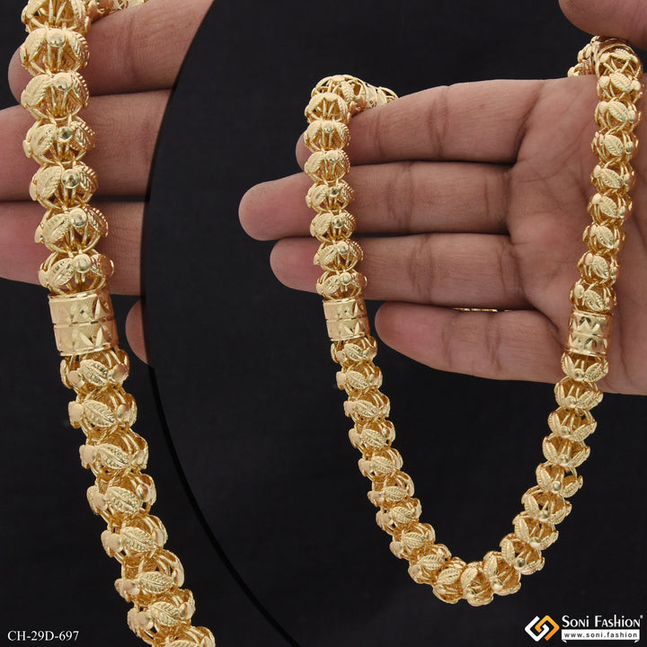 Discover the shining elegance of our Awesome Design Gold Plated Rajwadi Chain for Men. Featuring a beautiful filigree design, this 22-inch chain is expertly crafted with brass and finished with Hid_Reg_Plating for lasting durability. Elevate any look with this sophisticated golden chain.