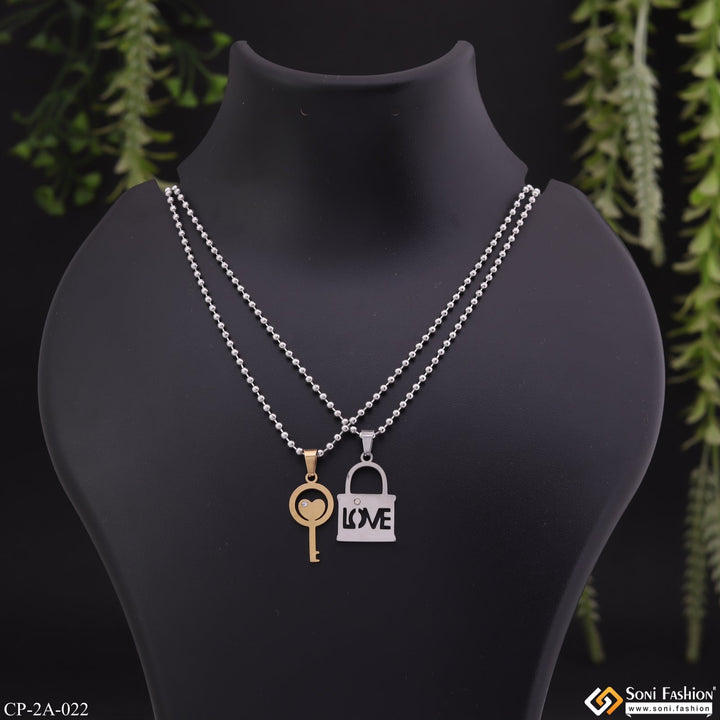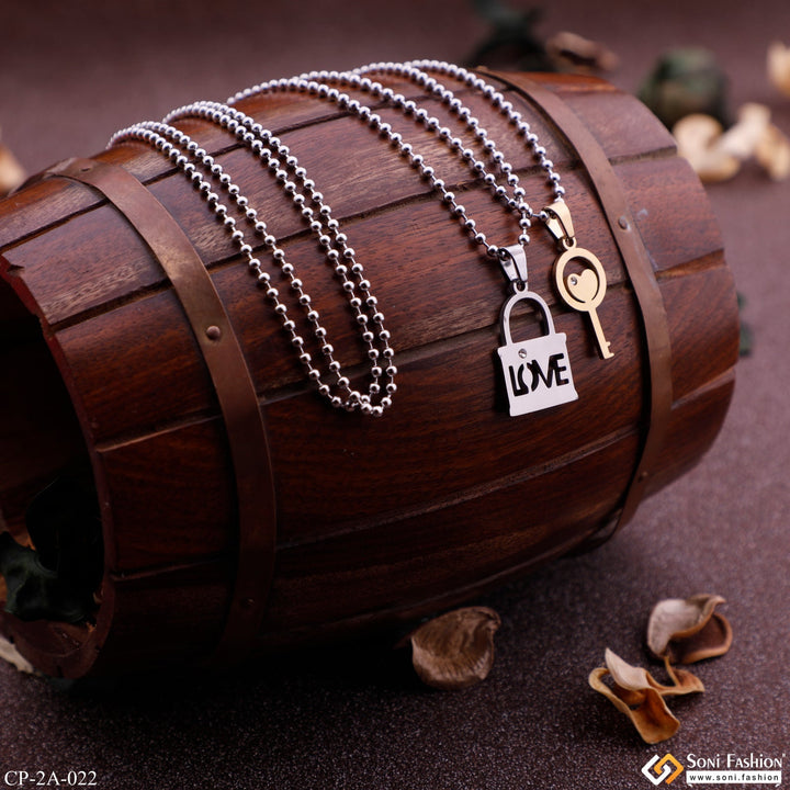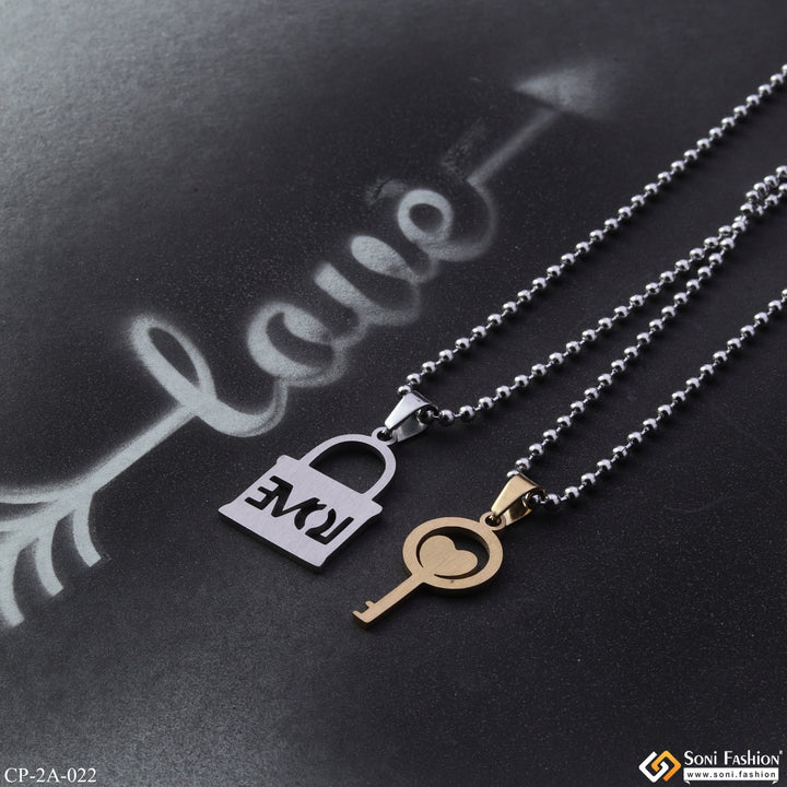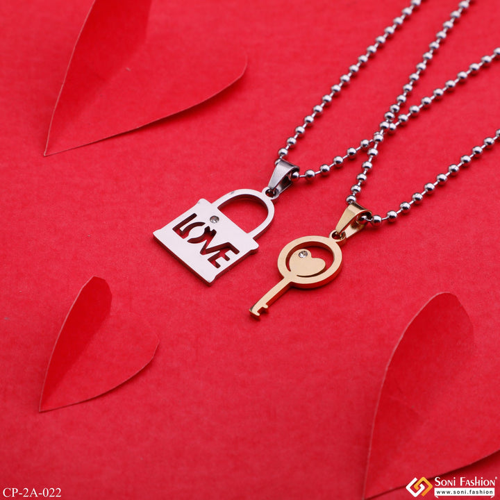 Love Heart in Lock & Key Couple Chain Pendant Set - Stainless Steel - Valentine Day - Style A022