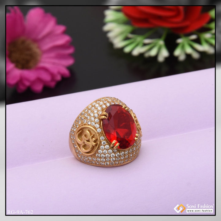 Red Stone with Diamond Decorative Design Best Quality Gold Plated Ring - Style A762