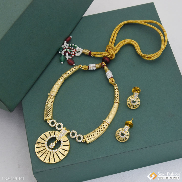 This beautiful gold plated necklace set for women features a thread design with a royal, shining appearance. The set includes a short necklace and a stunning design, both adorned with intricate filigree and sparkling diamond accents. Made with high-quality brass and Hid_Reg_Plating, this set offers a timeless and elegant addition to any outfit.