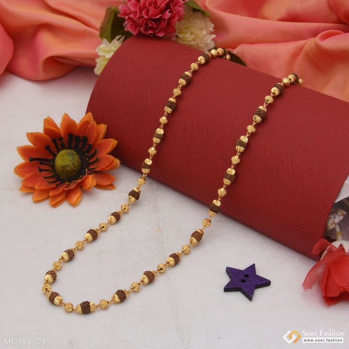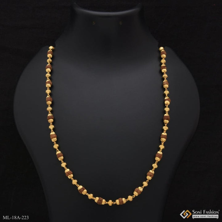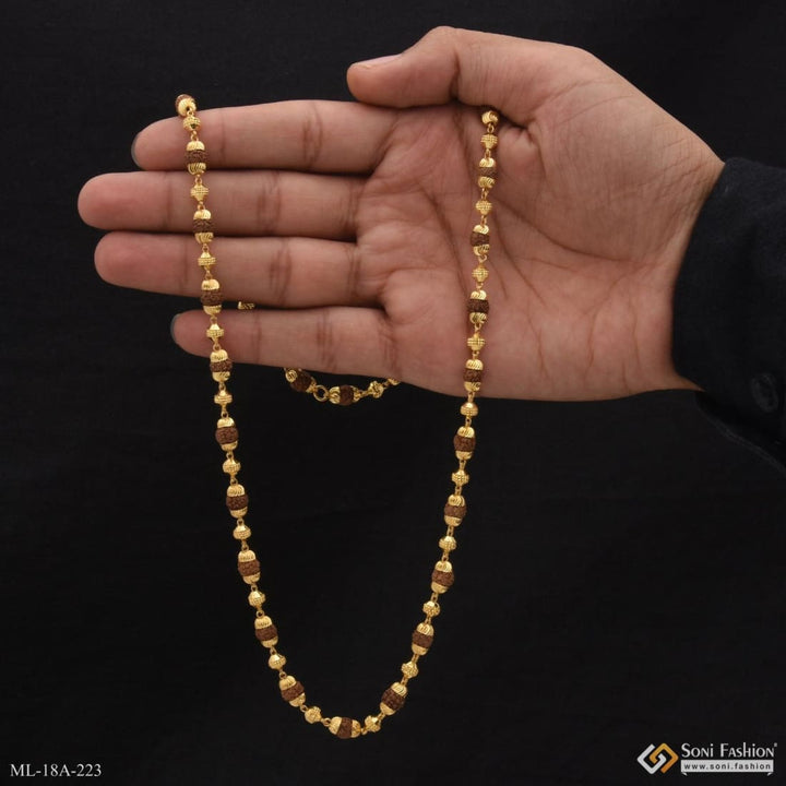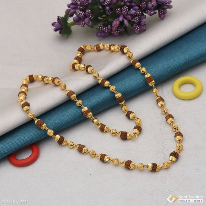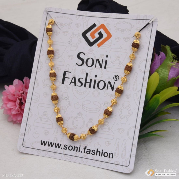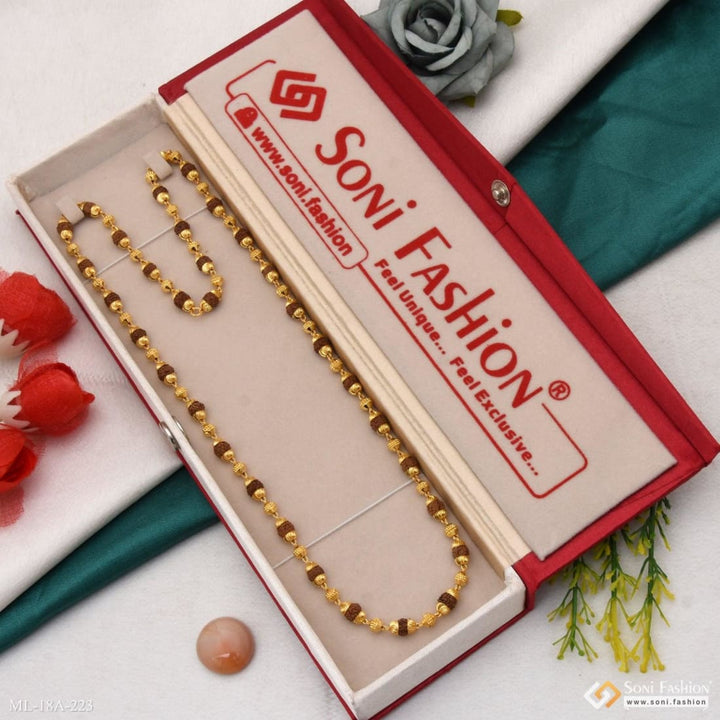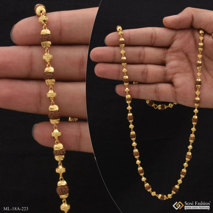 This 1 Gram Gold Plated 2 in 1 Delicate Design Rudraksha Mala for Men features a religious texture, a gold shine, and handcrafted Rudraksha, Miligram Gold, Golden Mala, Brown Mala, Brass,...