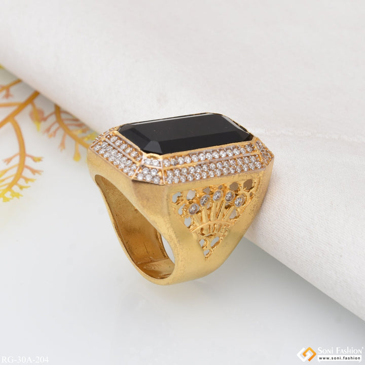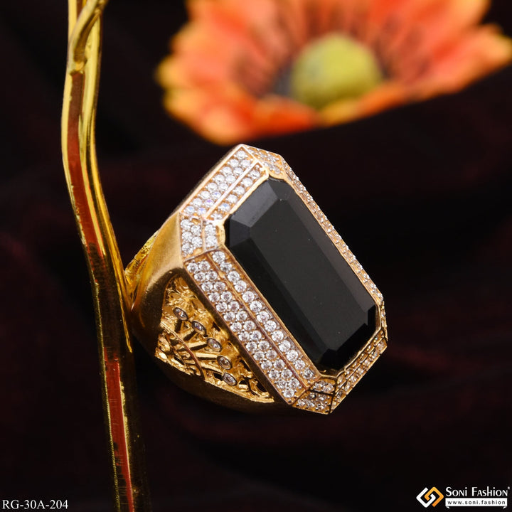 1 Gram Gold Plated Black Stone with Diamond Gold Plated Ring for Men - Style A204