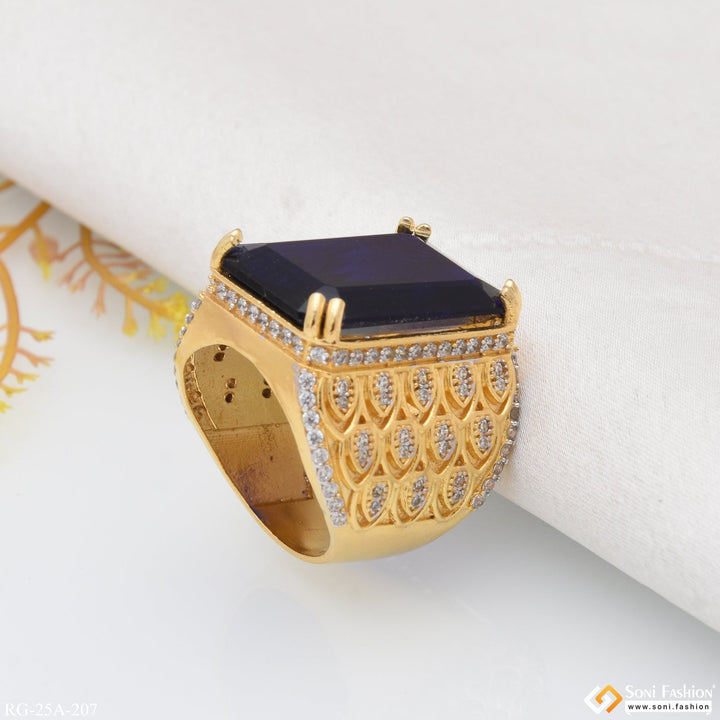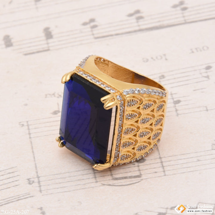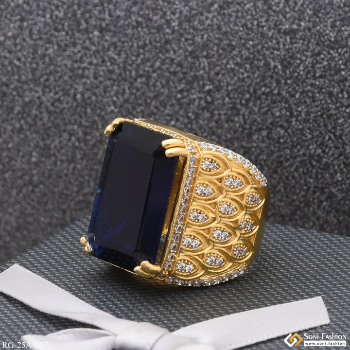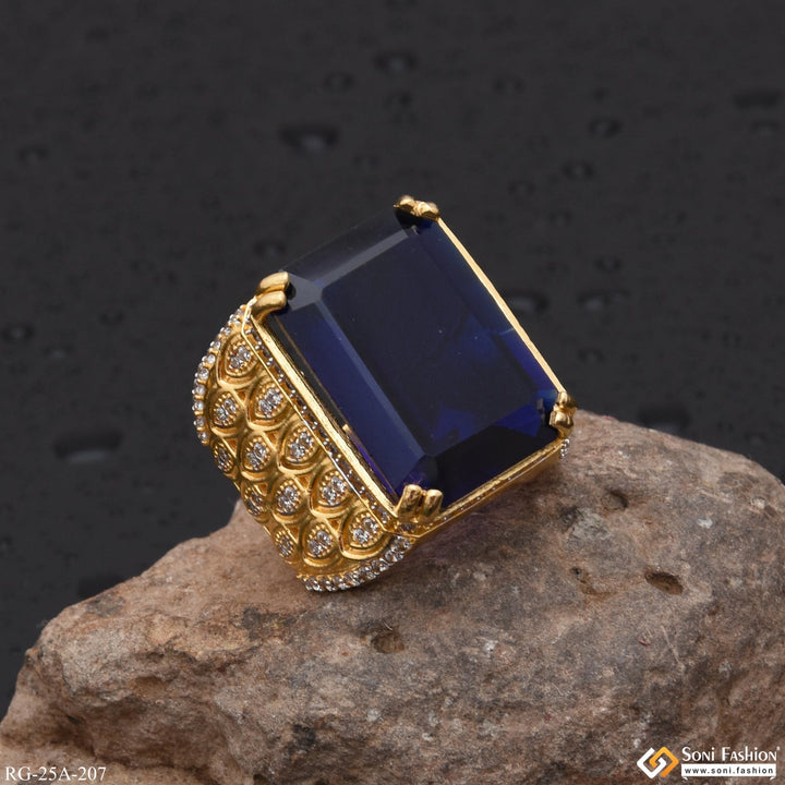 Make a bold statement with this 1 Gram Gold Plated Blue Stone with Diamond Gold Plated Ring. This ring features a textured stone with a shining finish and a royal miligram...