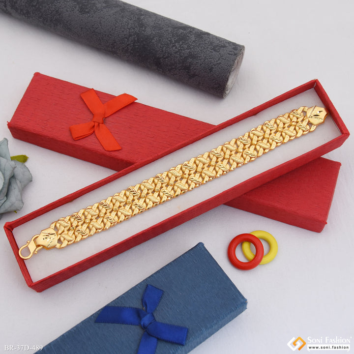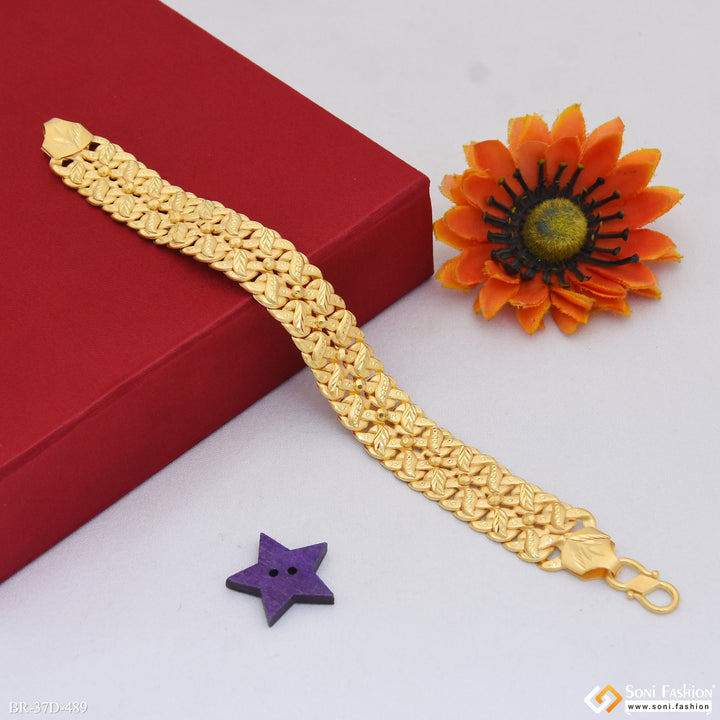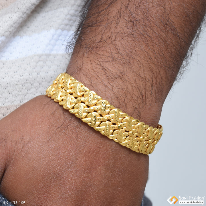 Discover elegance with our 1 Gram Gold Plated Delicate Design Pokal Bracelet for Men. This shining, royal bracelet is made of miligram gold and brass, featuring a filigree design. Embrace the hollow, golden bracelet that shines like no other. Add a touch of luxury to your style with Bracelet-Regular.