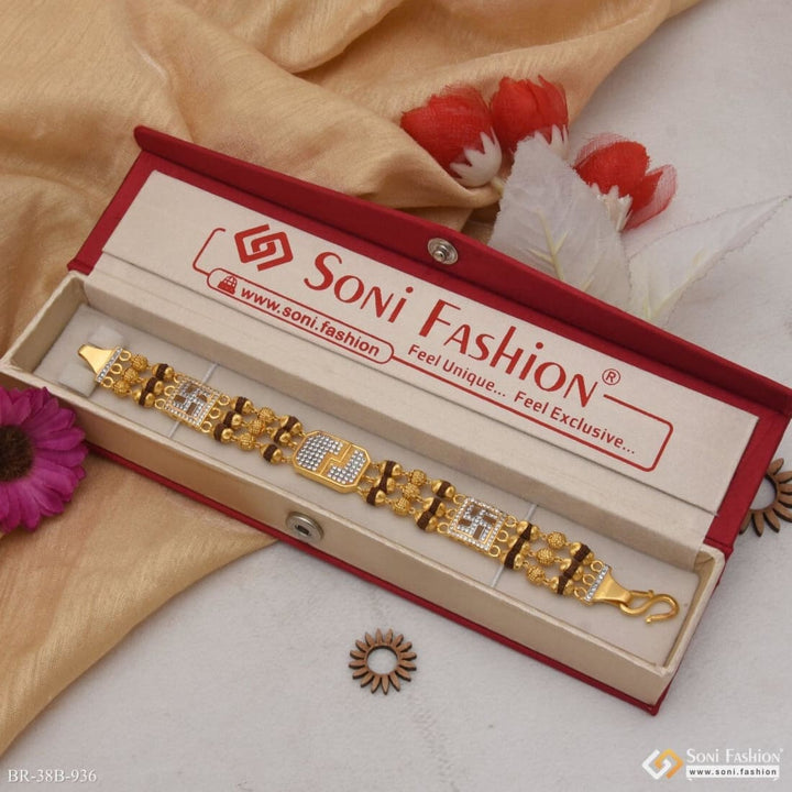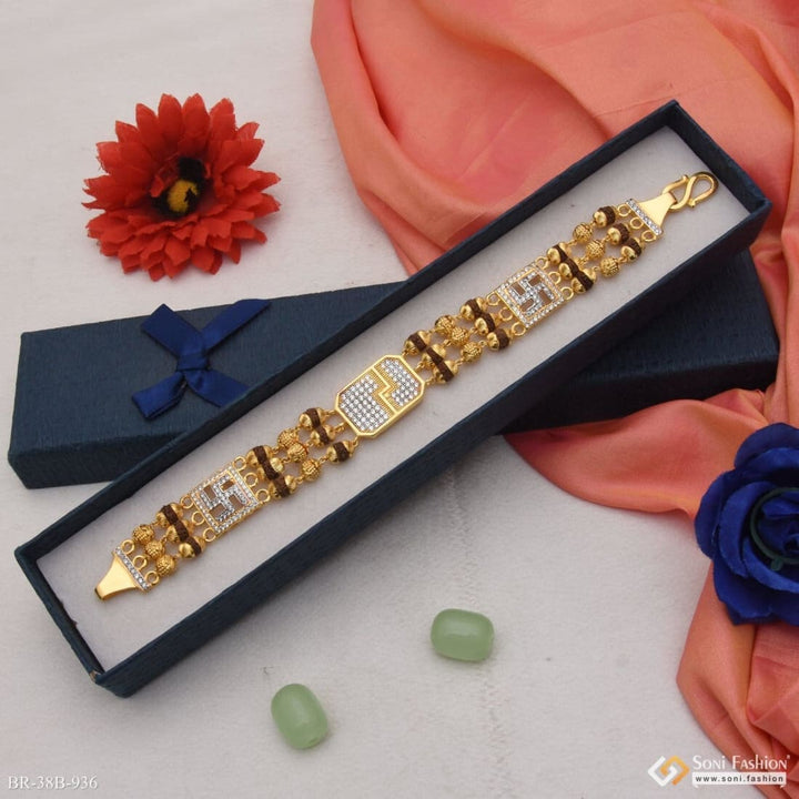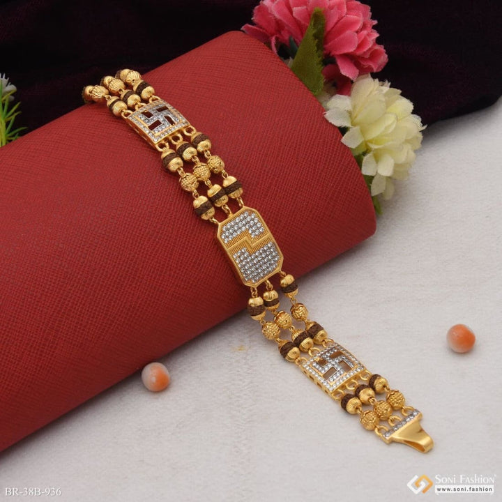Upgrade your style with our 1 Gram Gold Plated Square with Diamond bracelet, featuring a unique Funky design. Handmade with precision, this bracelet boasts textured brass, a Swastika symbol, Rudraksha bead,...