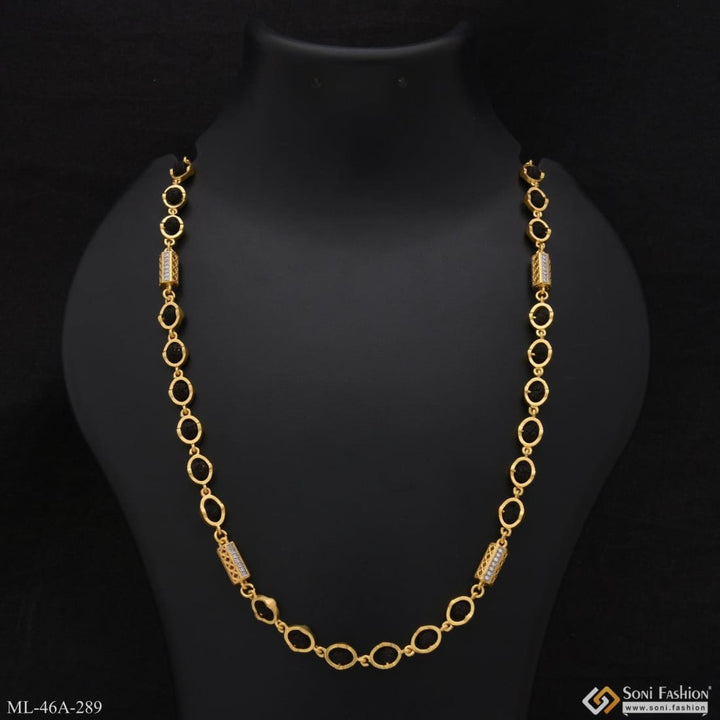 Expertly crafted for men, the 1 Gram Gold Plated Rudraksha Mala features a delicate design that adds a touch of elegance to any outfit. Each oval bead is adorned with a single diamond, creating a subtle yet luxurious look. Made with miligram gold, this golden mala is a perfect accessory for those seeking a religious and stylish piece.