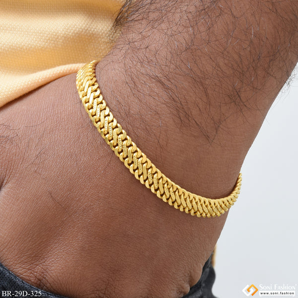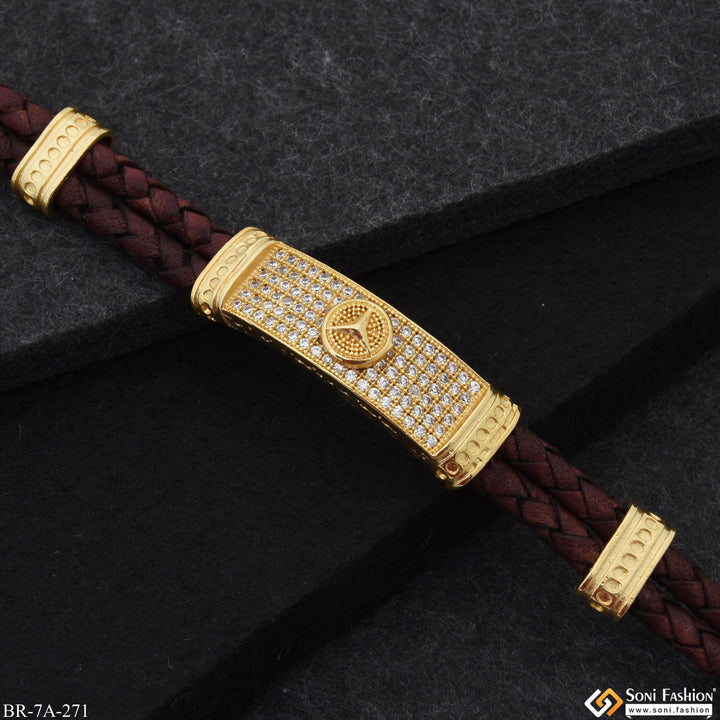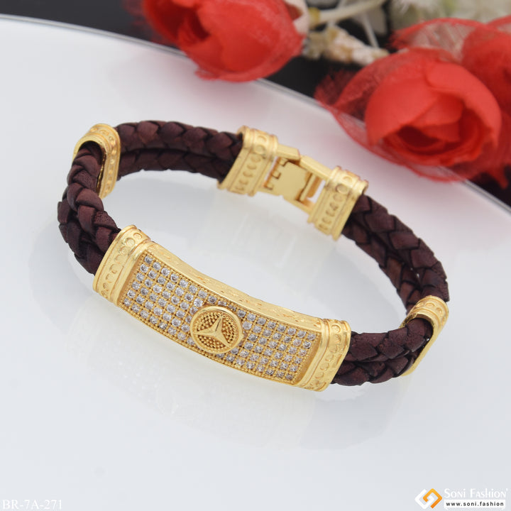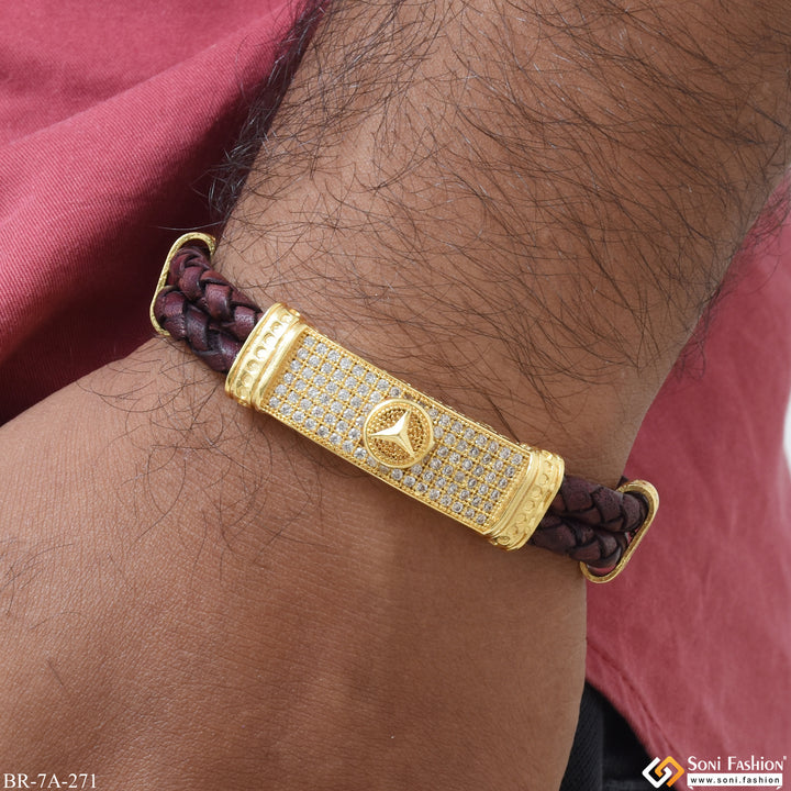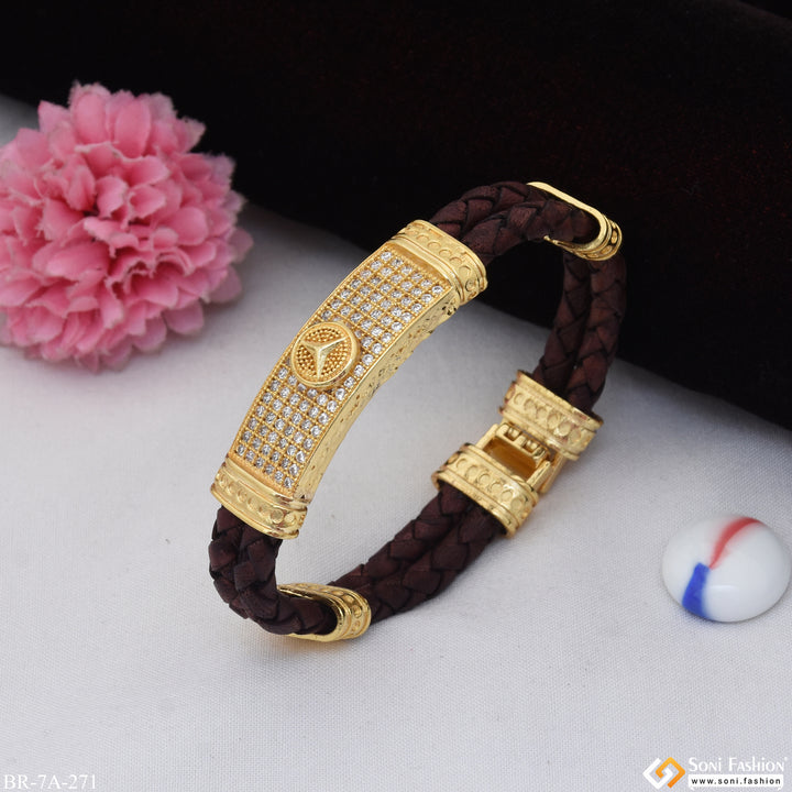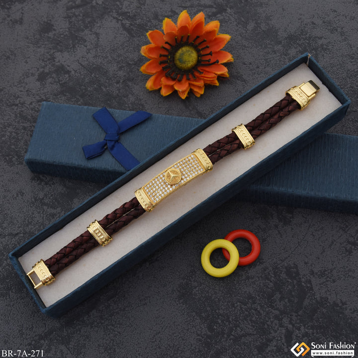 This Triangle Logo with Diamond Gold Plated Leather Braided Bracelet for Men combines rich brown leather with a royal matte finish and durable brass elements. The golden plating adds a refined touch, making it a stylish yet sturdy accessory for everyday wear. Its textured design ensures a distinctive look suitable for any occasion.