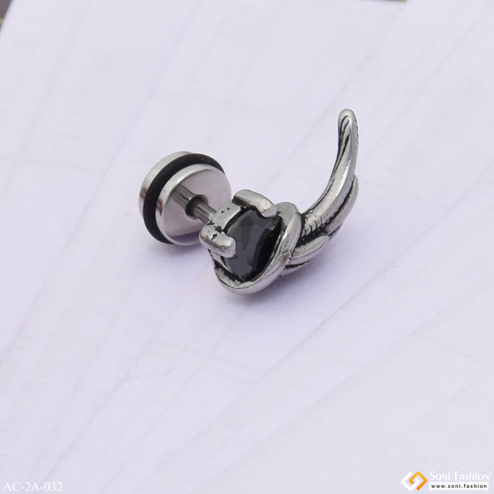 Expertly crafted with silver accessories and surgical steel, this Wing With Black Stone Stud Earring for Men exudes a hip hop vibe. Textured for added detail and featuring a stunning black stone, this earring is perfect for those who want to make a statement.