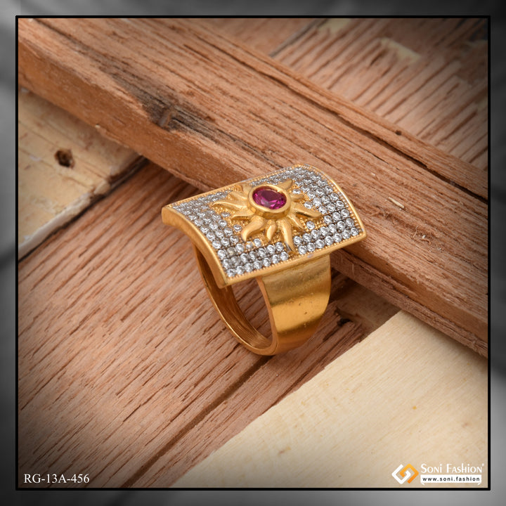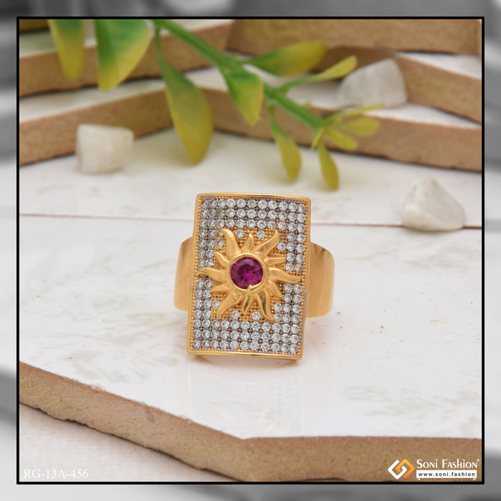This 1 Gram Gold Forming Sun with Diamond Fashionable Design Ring is perfect for any special occasion. Crafted with a textured sun and stone, it features a shining, royal rhodium finish and an intricate religious design. The pink ring is fashioned with miligram gold and a diamond, all set in a brass base. Glamorous and timeless, this ring is the ideal choice for any groom.