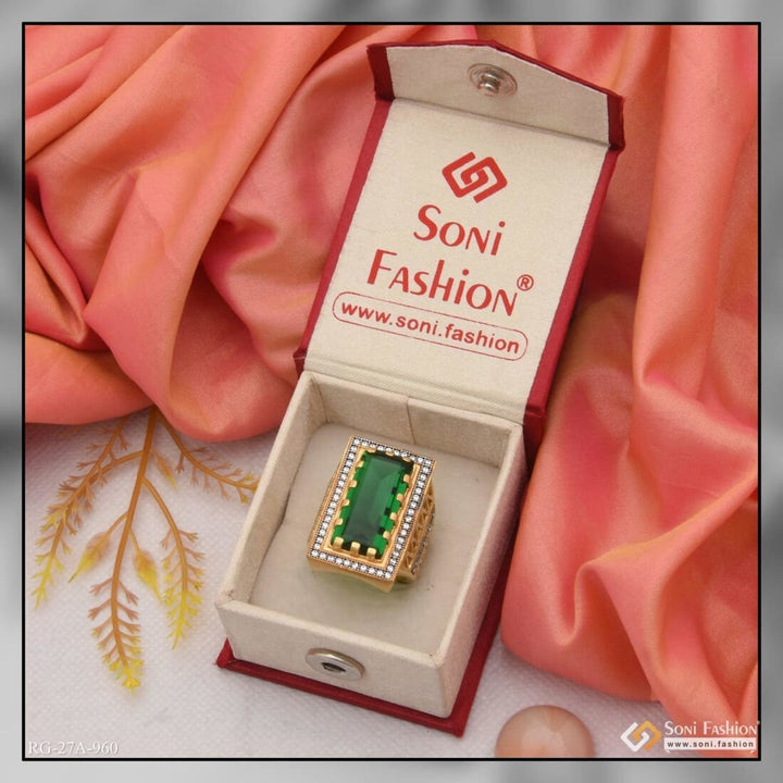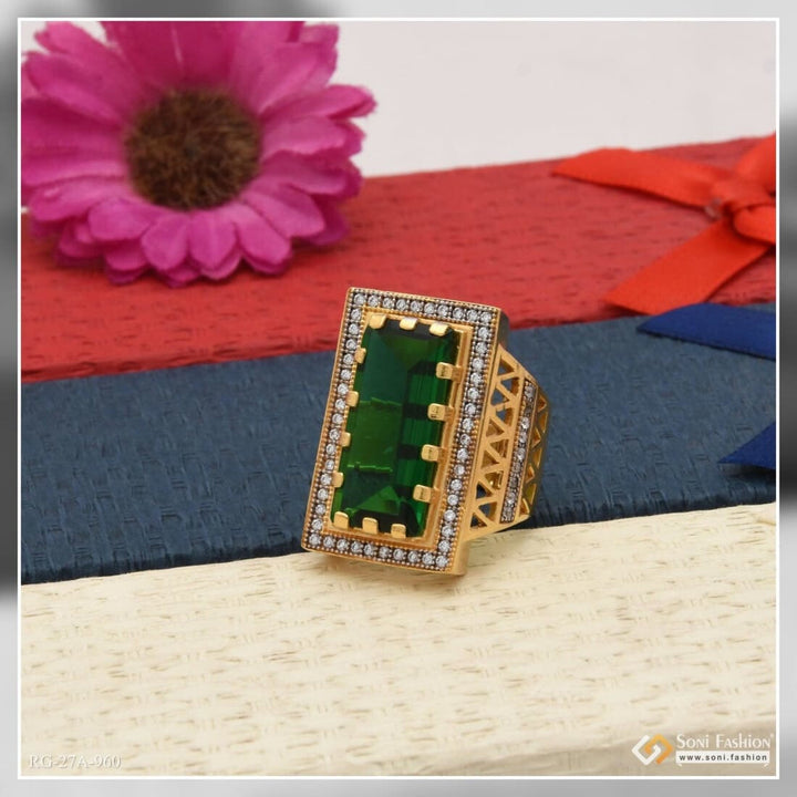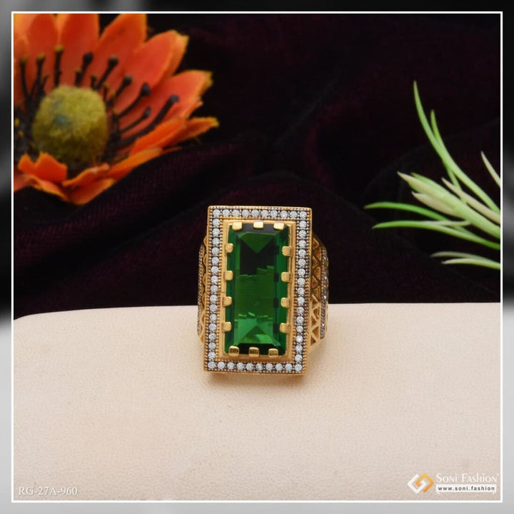 1 Gram Gold Forming Green Stone with Diamond Delicate Design Ring for Men - Style A960