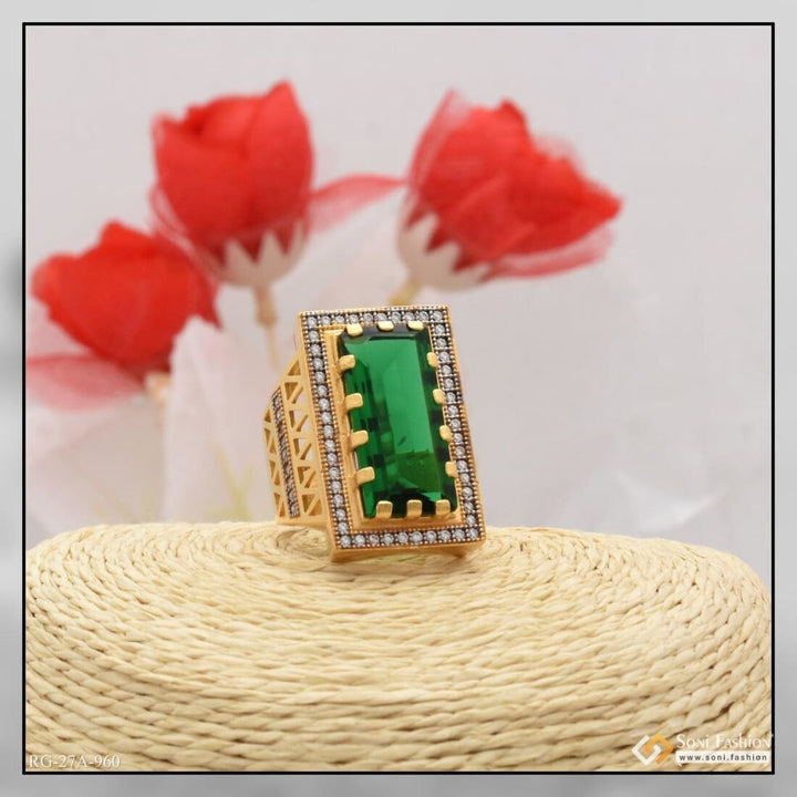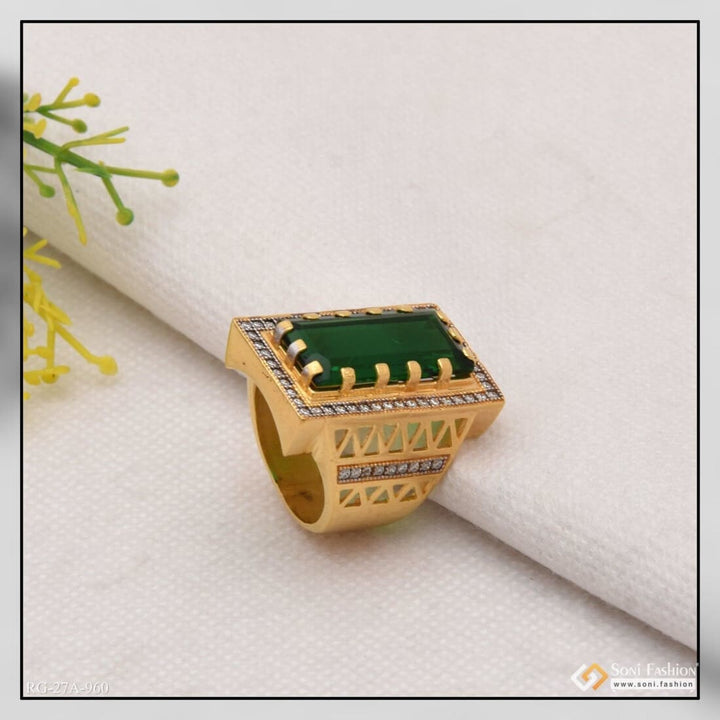 Presenting the 1 Gram Gold Forming Green Stone with Diamond Delicate Design Ring for Men. Crafted in Brass with a handmade Green Stone formation, this ring is further adorned with Miligram...