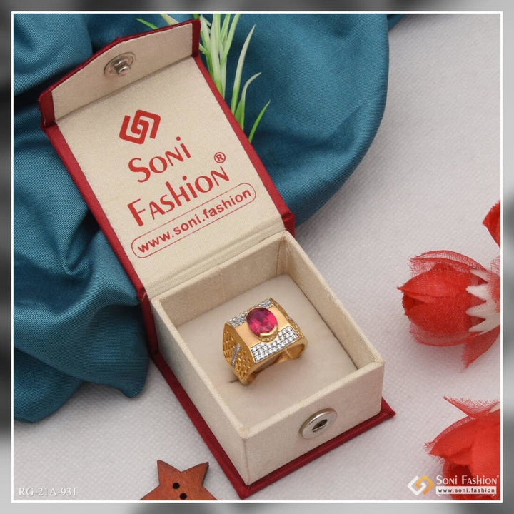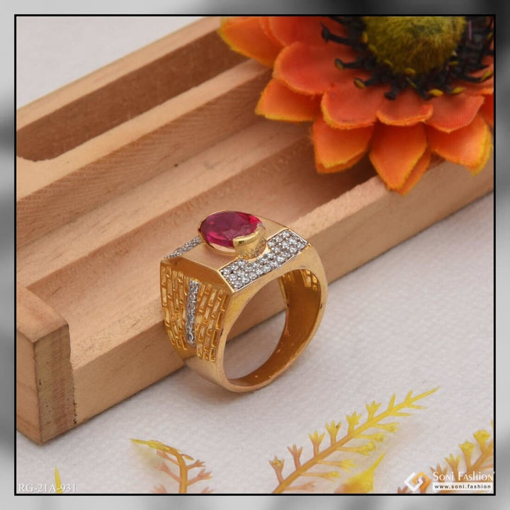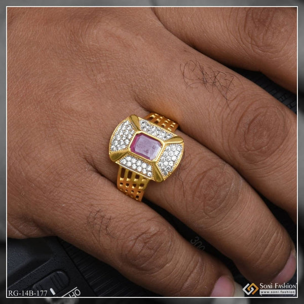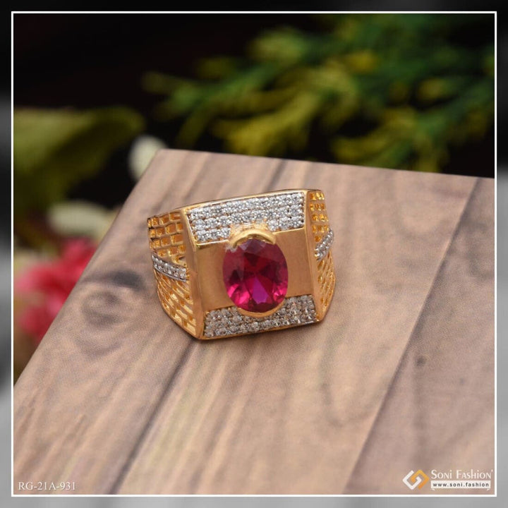 1 Gram Gold Plated Pink Stone With Diamond Best Quality Ring For Men - Style A931