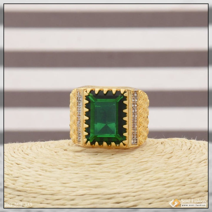 1 Gram Gold Plated Green Stone With Diamond Funky Design Ring For Men - Style B355