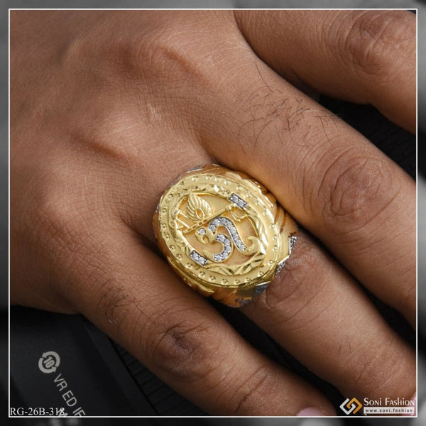 This 1 gram gold plated ring features a unique square design with a spiritual touch. The green stone and diamond add a touch of elegance to the miligram gold and brass material. Embrace your spiritual side with the symbolic Om and Aum engravings on this golden ring.
