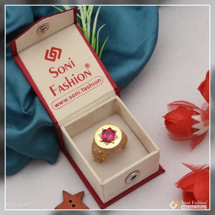 This stunning 1 Gram Gold Plated Pink Stone With Diamond Gorgeous Design Ring features a unique textured design, rhodium stone, and miligram gold matt finish. This brass-crafted piece is perfect for adding a touch of elegance to any outfit, making it a great choice for both brides and grooms. A captivating diamond adds the finishing touch to this luxurious design.