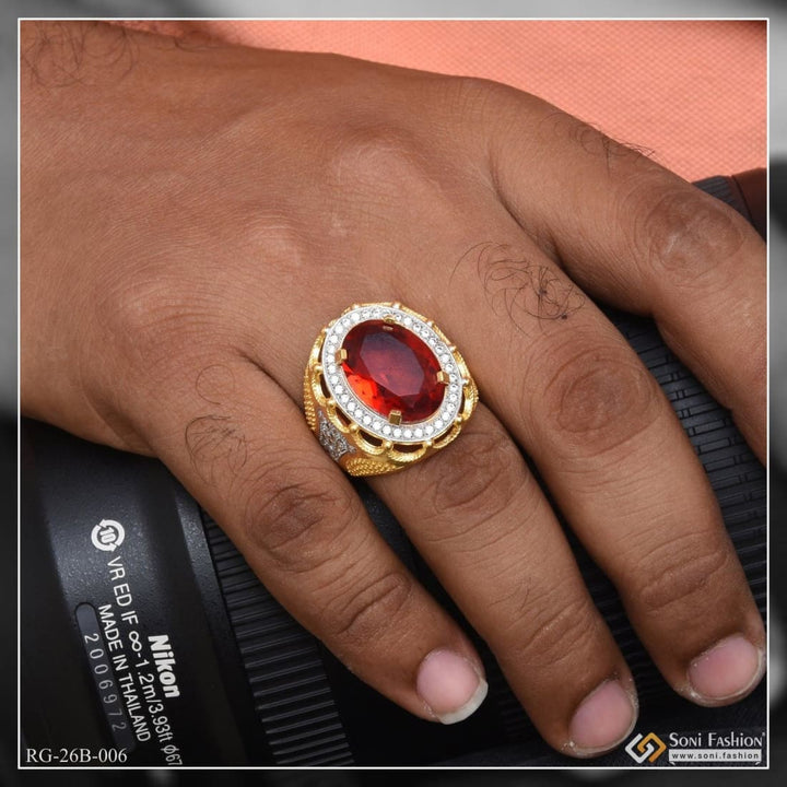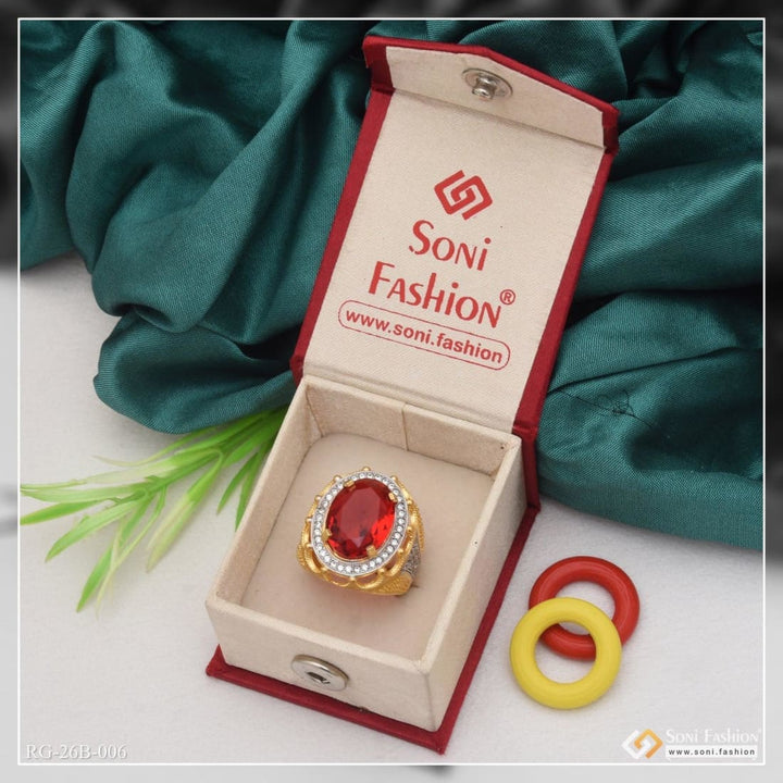 1 Gram Gold Plated Red Stone with Diamond Best Quality Ring for Men - Style B006