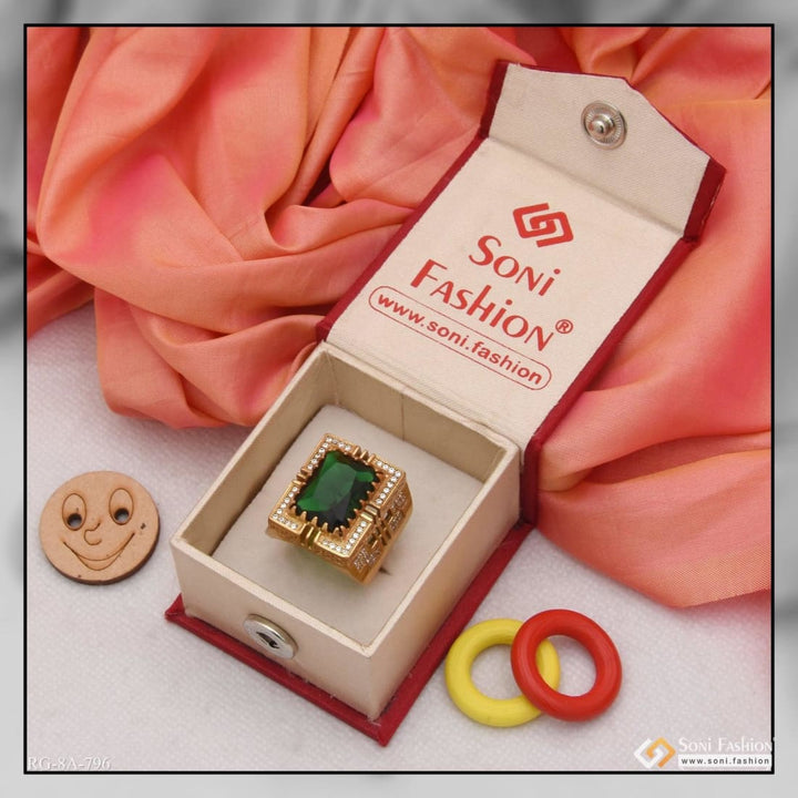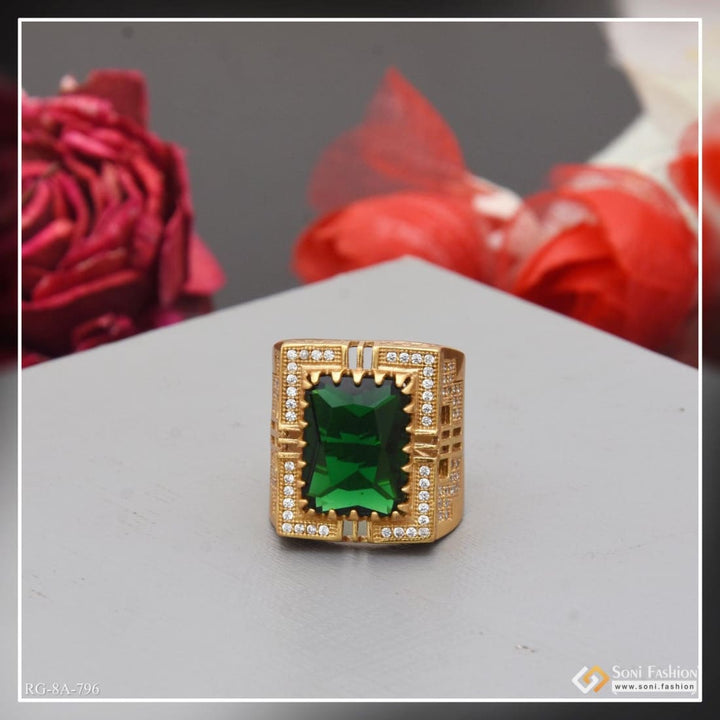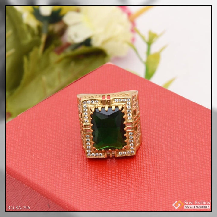 Green Stone With Diamond Fashionable Design Gold Plated Ring For Men - Style A796