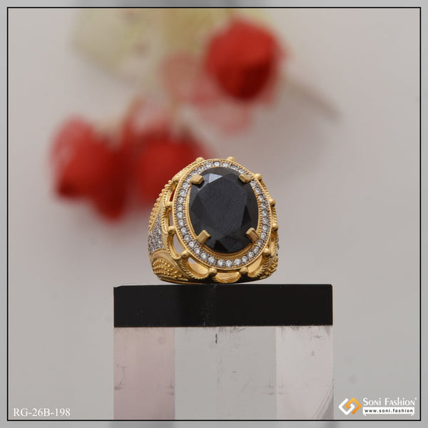 1 Gram Gold Plated Black Stone with Diamond Best Quality Ring for Men - Style B198