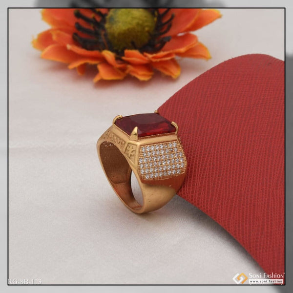Red Stone With Diamond Finely Detailed Design Gold Plated Ring For Men - Style B295