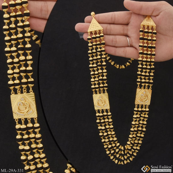 Expertly crafted with 1 gram of gold plating, this Rajwadi design shining golden mala features textured Rudraksha beads and a streamlined filigree design. Handmade with precision and engraved with the...