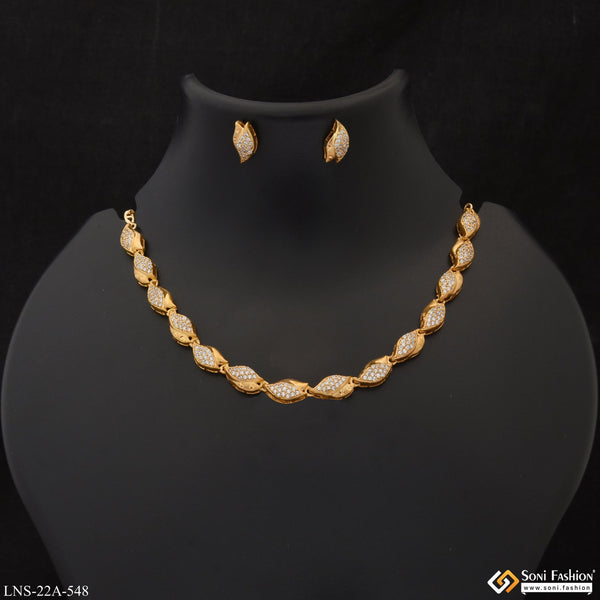 This elegant gold-plated mangalsutra features a shining finish with a single line design, crafted from durable brass and adorned with black beads and sparkling diamond accents. Its short length and...