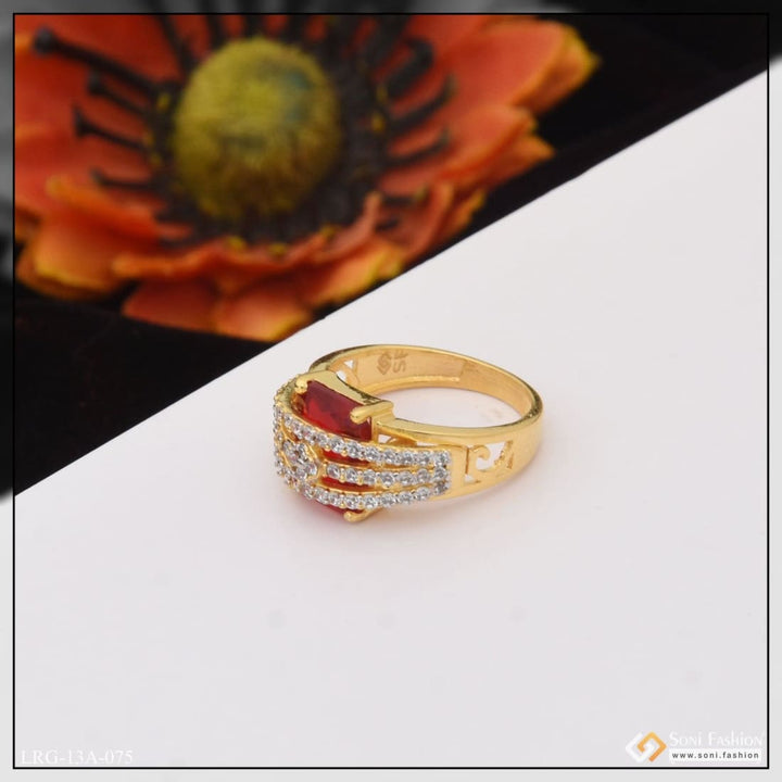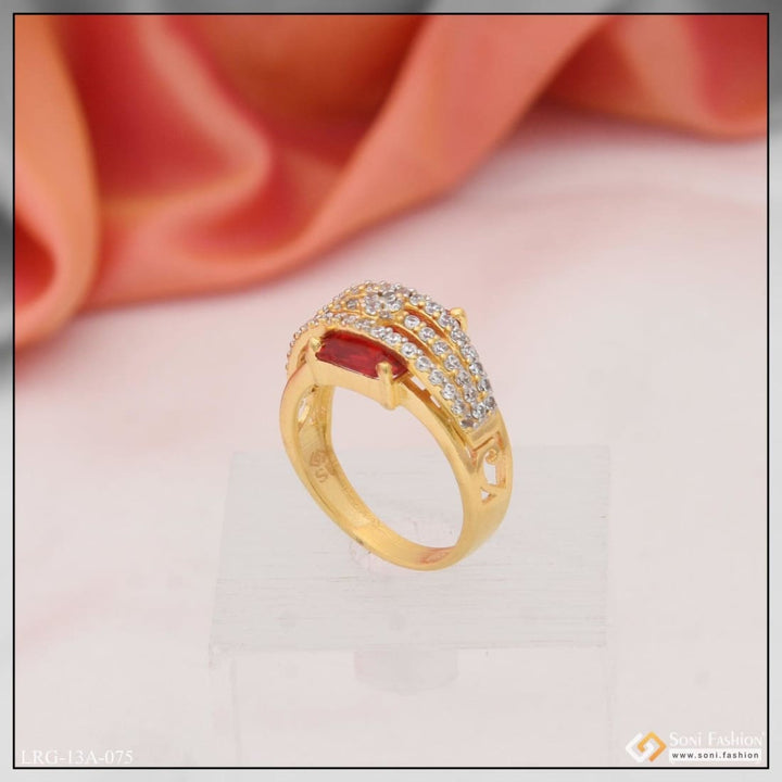 1 Gram Gold Plated Red Stone With Diamond Chic Design Ring For Ladies - Style Lrg-075