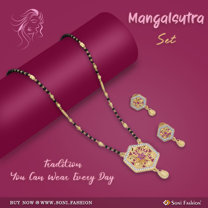 Introducing our latest 1 Gram Gold Plated Designer Mangalsutra Set, perfect for the modern bride. This traditional set features a textured, shining pink Mangalsutra with diamond accents. Made with miligram gold and a matt finish, this set is the latest trend in bridal jewelry. The hexagone shape and black Moti add a touch of elegance to the golden Mangalsutra set. Upgrade your bridal look with this one line set.