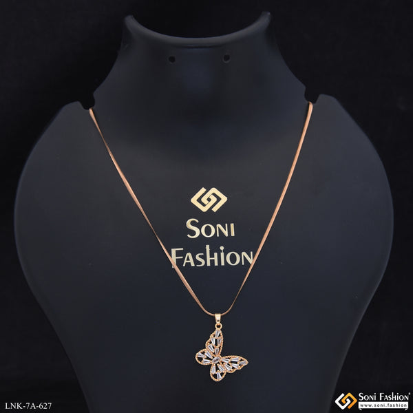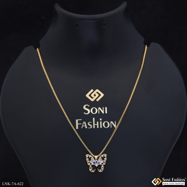 This royal, half moon shaped pendant features a stunning butterfly design, crafted with shining brass and a white necklace made from the latest trend in hid_reg_plating. The delicate diamond accents add a touch of elegance to this gold plated chain pendant, perfect for any fashionable lady.