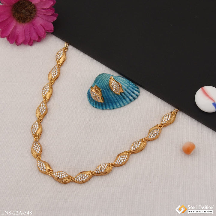 Introducing our latest high-class necklace set. Crafted with a textured and shining golden design, this set exudes a royal elegance. Made with hidden-reg-plating brass and adorned with diamonds, this set is perfect for making a statement and staying on-trend.